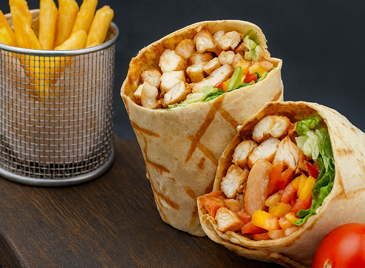 Izgara tavuk dilimleri, üç renkli biber, soğan, avokado sos, salsa sos, tatlı şili sos ve tortilla ekmeği ve özel sos ile servis edilir